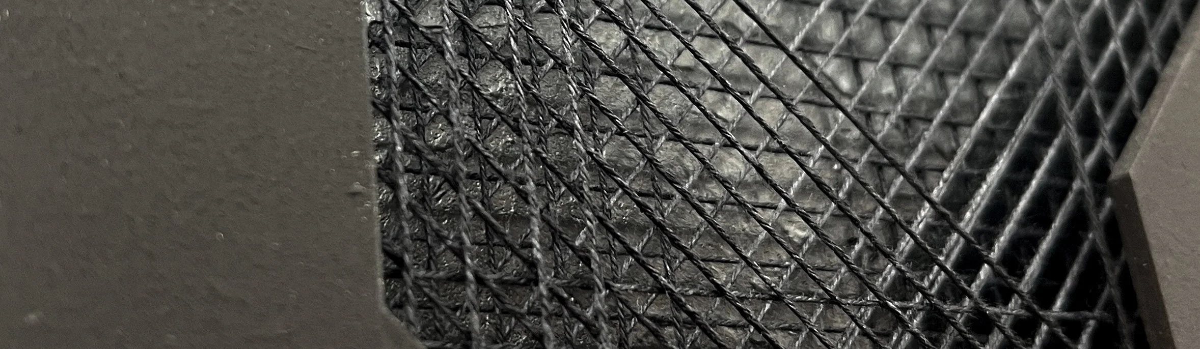 Mit dieser Arbeit im Format 30x40cm habe ich das erste Mal mit Fadenstrukturen experimentiert. In zwei mit Abstand zueinander angeordneten Layern habe ich den schlichten Flächen im Vorder- und Hintergrund Fadenflächen entgegengesetzt. Fläche und Geflecht stehen sich hierbei verstärkend gegenüber.